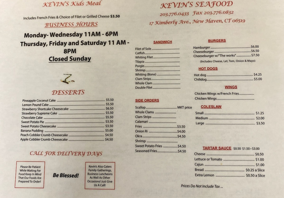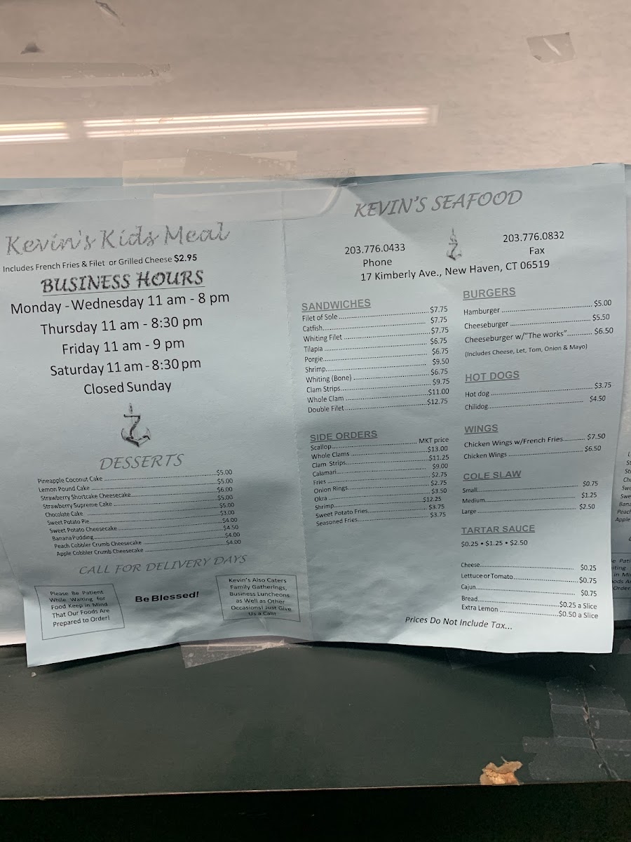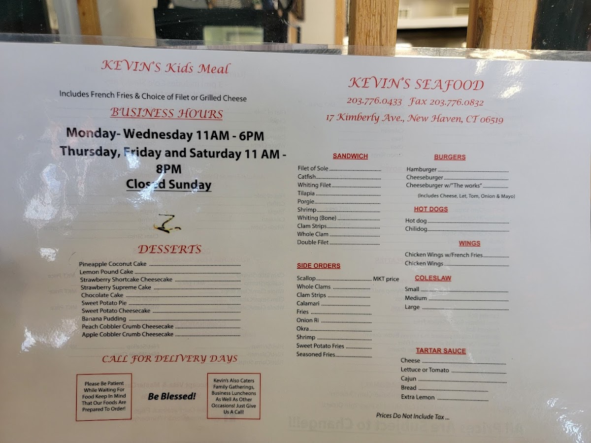 Welcome to Kevin's Seafood, a beloved gem located at 17 Kimberly Ave in New Haven, CT. For over 50 years, this family-run establishment has served up some of the freshest seafood dishes in a warm, community-oriented atmosphere. The menu features an array of highlights, from the flaky Filet of Sole and succulent Shrimp to crispy Onion Rings that perfectly complement any dish. Diners rave about the homemade sauces, particularly the tartar sauce that elevates the fried seafood experience. Desserts like the Sweet Potato Cheesecake offer a delightful way to end your meal, showcasing the kitchen's commitment to homemade goodness. Regulars adore the welcoming vibe, as Kevin and his daughter make each visit feel personal. Whether you’re indulging in their famous shrimp roll or savoring the fried clam strips, every bite resonates with flavor and craftsmanship. Make sure to visit Kevin’s Seafood when you’re in town; it’s an experience worth relishing!