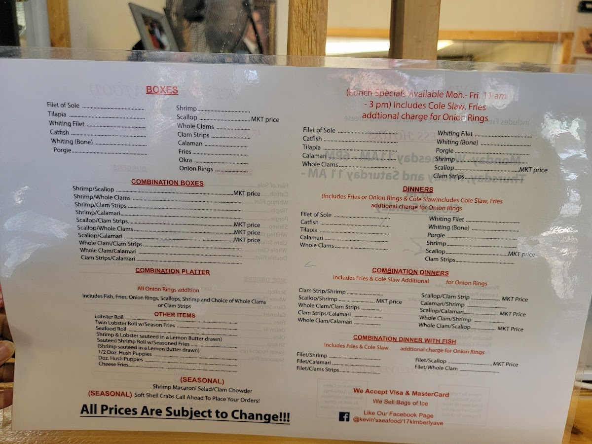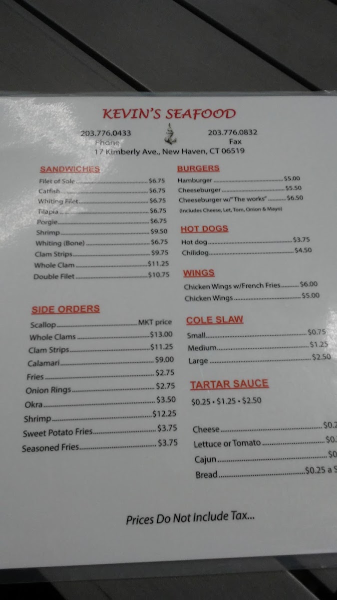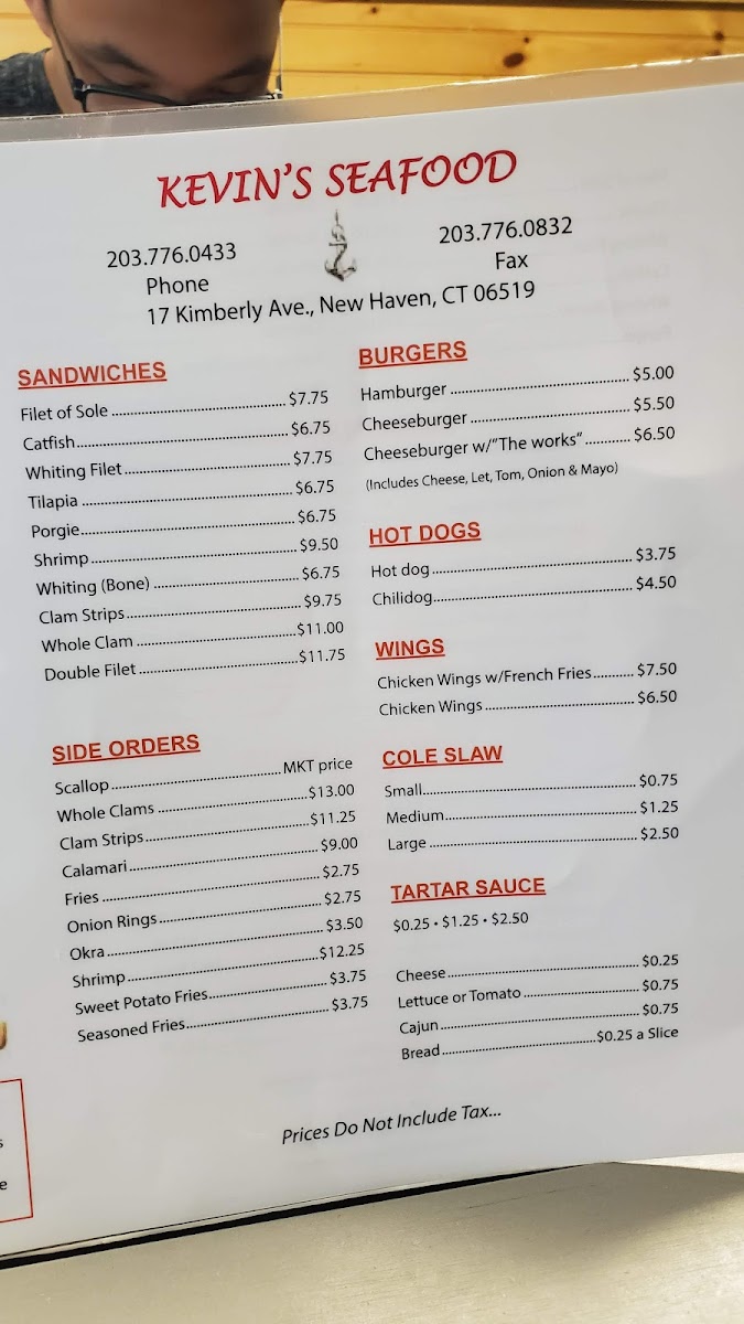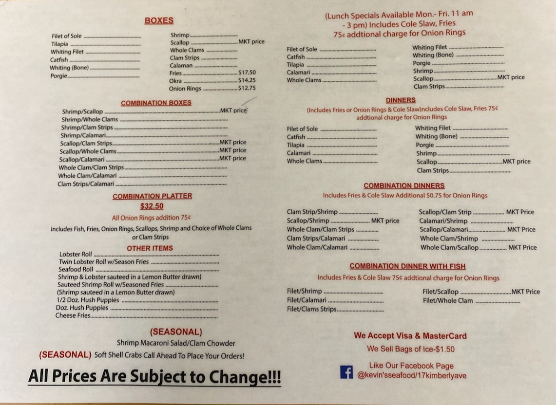 Welcome to Kevin's Seafood, a beloved gem located at 17 Kimberly Ave in New Haven, CT. For over 50 years, this family-run establishment has served up some of the freshest seafood dishes in a warm, community-oriented atmosphere. The menu features an array of highlights, from the flaky Filet of Sole and succulent Shrimp to crispy Onion Rings that perfectly complement any dish. Diners rave about the homemade sauces, particularly the tartar sauce that elevates the fried seafood experience. Desserts like the Sweet Potato Cheesecake offer a delightful way to end your meal, showcasing the kitchen's commitment to homemade goodness. Regulars adore the welcoming vibe, as Kevin and his daughter make each visit feel personal. Whether you’re indulging in their famous shrimp roll or savoring the fried clam strips, every bite resonates with flavor and craftsmanship. Make sure to visit Kevin’s Seafood when you’re in town; it’s an experience worth relishing!